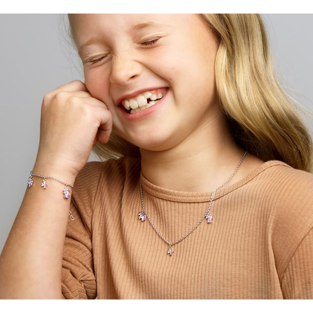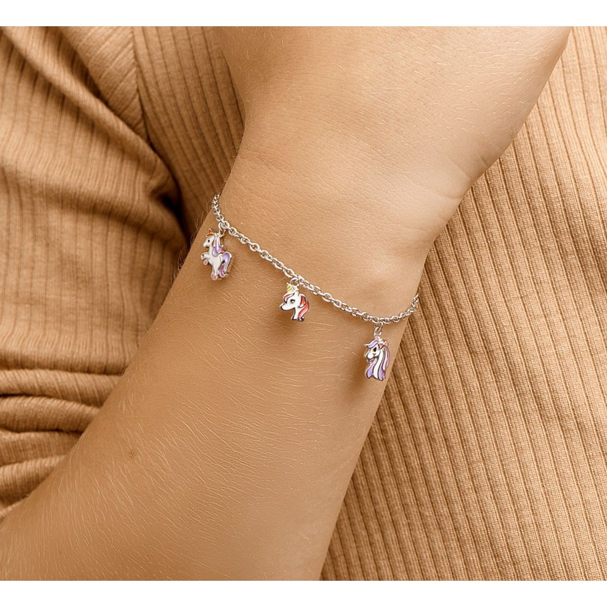 Gerhodineerd 925 zilveren armband uitgevoerd met drie verschillende hangers in de vorm van een eenhoorn en een stevige karabijn sluiting. De armband heeft een draaglengte van 13cm met een extensie van 3cm. De hangers hebben een afmeting van 10.5x9mm, 9x6,5mm en 11x7mm.