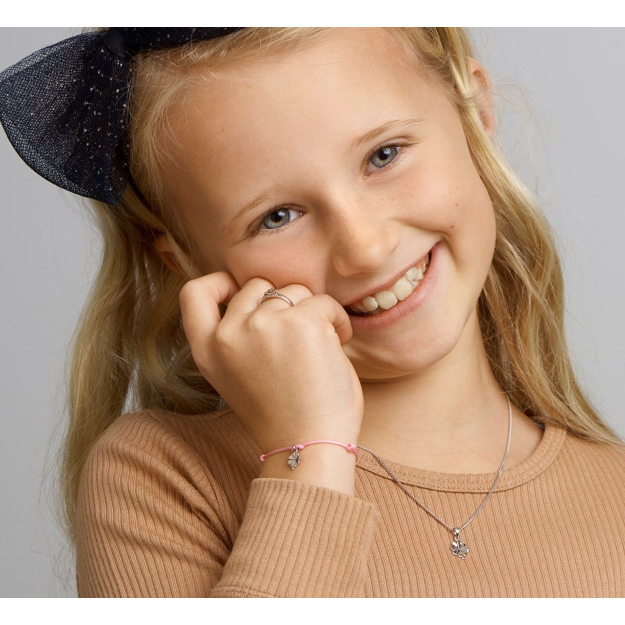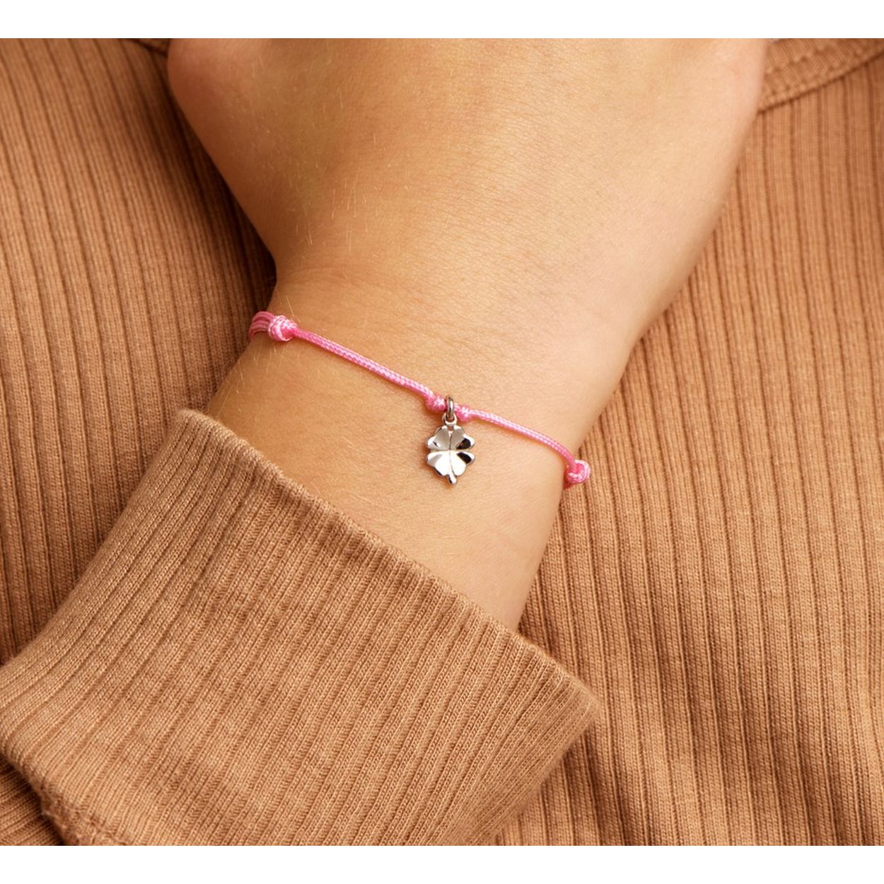 Roze gevlochten armband uitgevoerd met een hanger in de vorm van een klavertje. De armband heeft draaglengtes van 9 t/m 19cm. De hanger heeft een afmeting van 10x10mm.