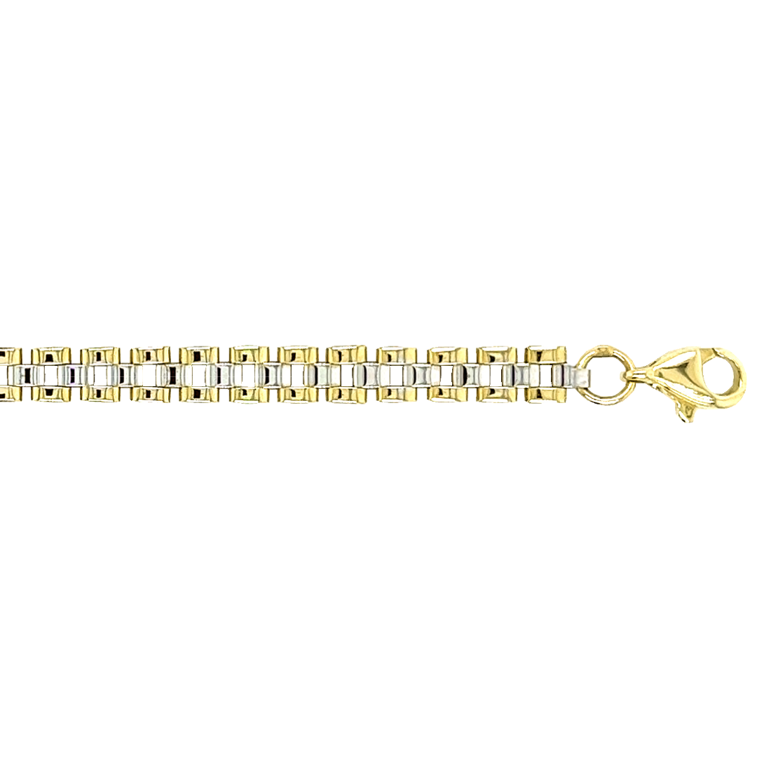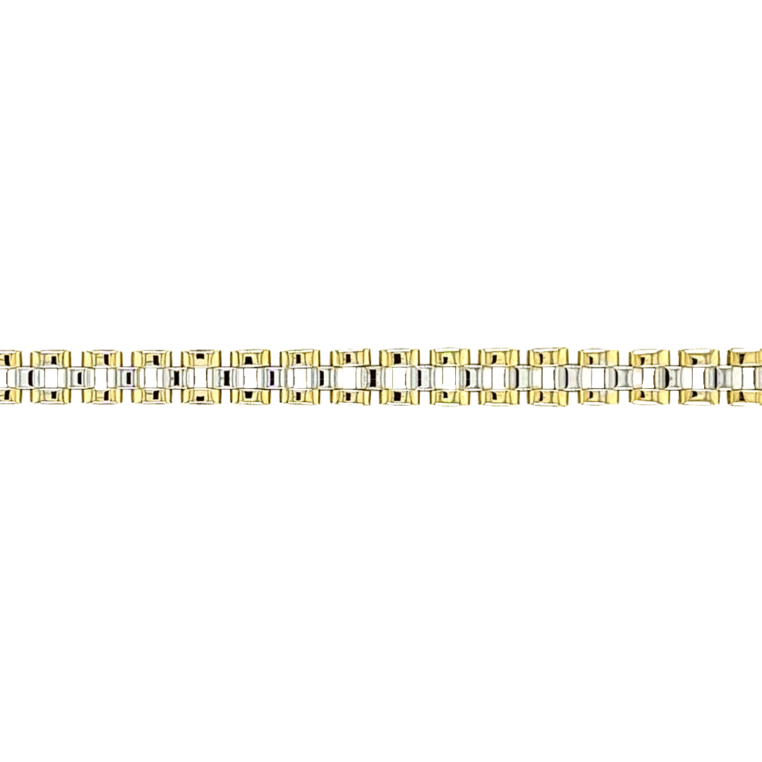 Deze 14-karaats bicolor gouden Rolex schakelarmband is ontzettend elegant. De armband bestaat uit drie rijen met licht gebolde schakelstukken. De armband is fijn gepolijst en heeft hierdoor een mooie glans. De middelste schakelstukken zijn witgoud van kleur en de buitenste schakelstukken zijn geel goud van kleur.