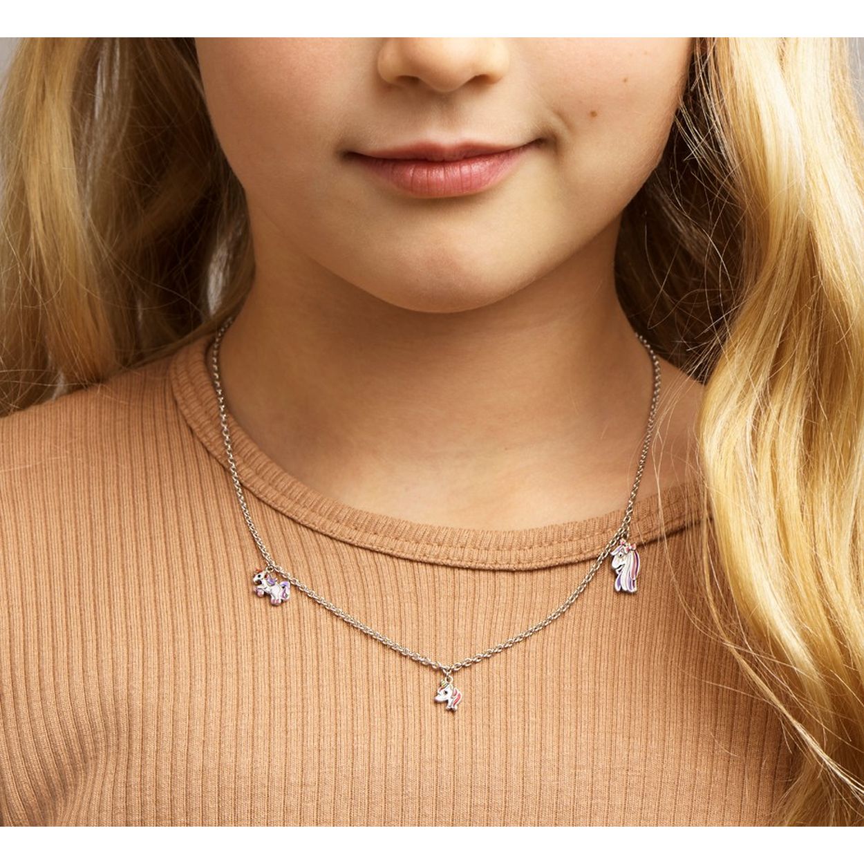 Gerhodineerd 925 zilveren anker collier uitgevoerd met drie verschillende hangers in de vorm van een eenhoorn en een stevige karabijn sluiting. Het collier heeft een draaglengte van 36cm met een extensie van 4cm. De hangers hebben een afmeting van 10.5x9mm, 9x6.5mm en 11x7mm.