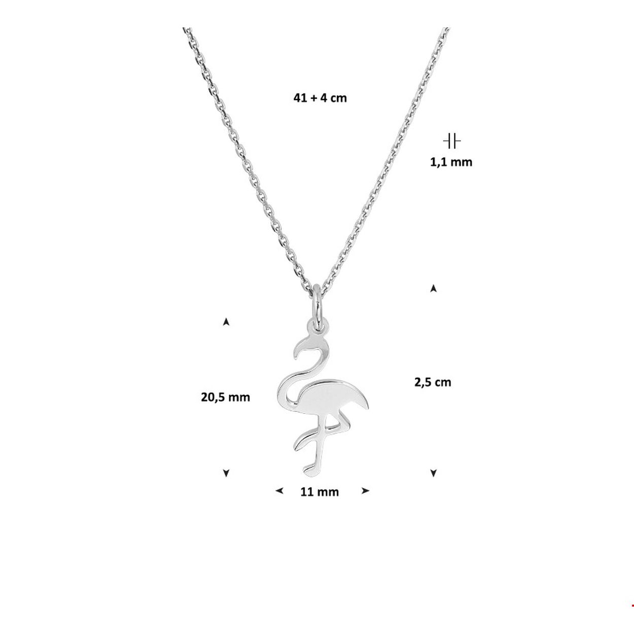 Trendy gerhodineerd zilveren collier met flamingo hanger met een hoogte van 2.5cm. Het collier heeft een draaglengte van 41cm en een extensie van 4cm. Uitgevoerd met een stevige karabijn sluiting.