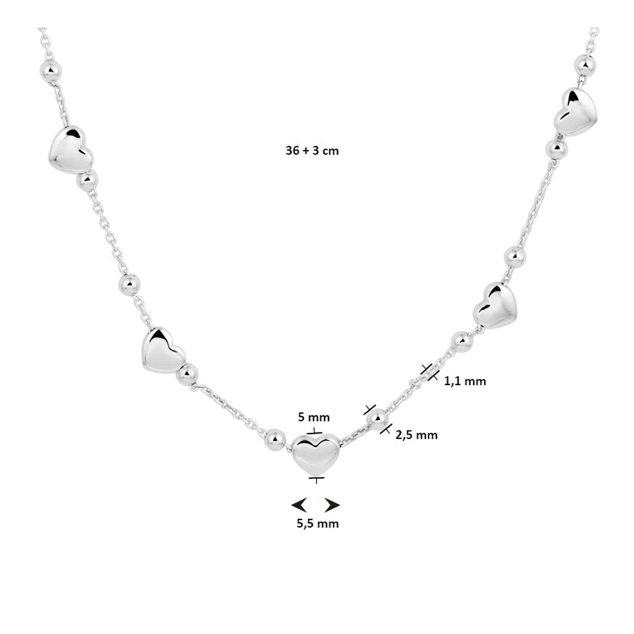Gerhodineerd 925 zilveren collier uitgevoerd met bolletjes en schattige hartjes. Het collier heeft een draaglengte van 36cm met een extensie van 3cm en een stevige karabijn sluiting. De hartjes hebben een afmeting van 5x5.5mm.