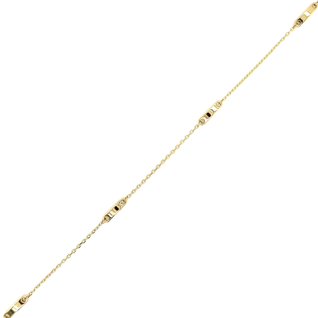 Dit fijne 14-karaats geel gouden armbandje is anker geschakeld en wordt onderbroken door kleine gouden schakelstukken. De armband is verstelbaar van 17cm tot 19cm.