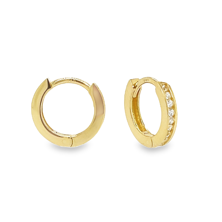 Geel gouden rij klapoorringen zijn altijd een goede toevoeging aan je sieraden collectie. Deze oorringen zijn 'klein' van formaat en vallen kort om het oor (zie afmetingen). De steentjes zijn briljant geslepen zirkonia's.