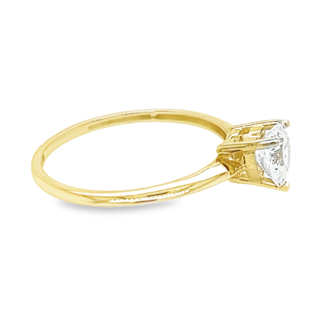 Deze geel gouden solitairring is onwijs mooi gemaakt. De zirkonia steen is heart geslepen en gezet tussen 4 zetpoten. De heart slijpvorm wordt minder gebruikt dan andere slijpvormen, wat eigenlijk zonde is want het zorgt voor een prachtige schittering.