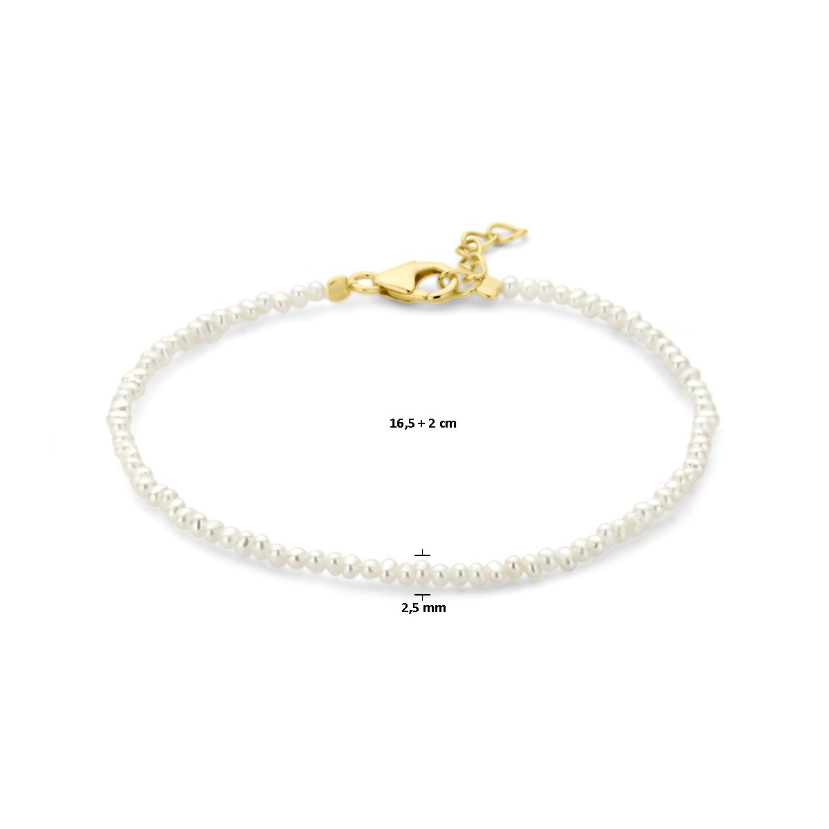 Verguld op 925 zilveren armband uitgevoerd met parels. De armband heeft een draaglengte van 16.5cm met 2cm extensie. Geen garantie op de plating.