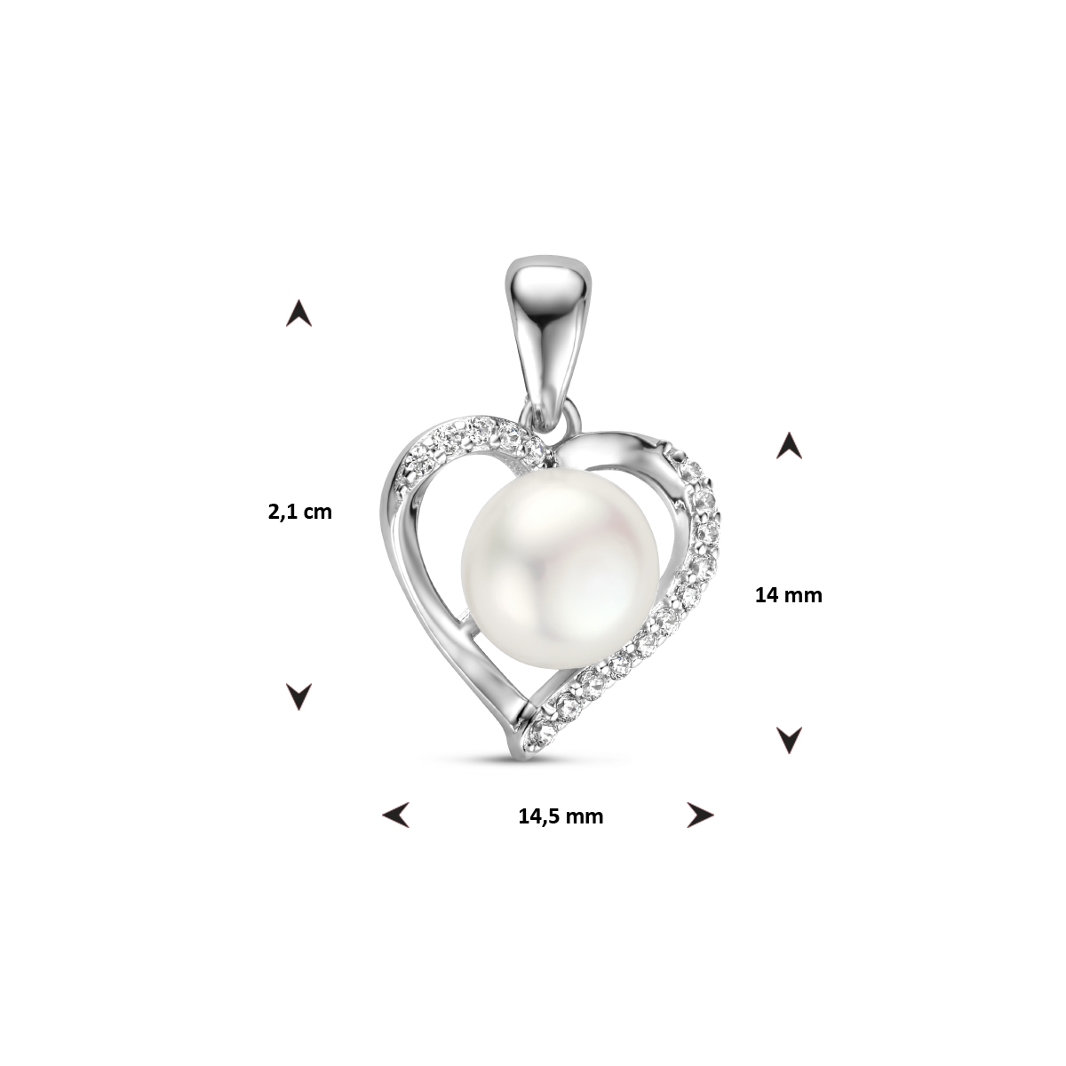 Gerhodineerd 925 zilveren hanger uitgevoerd met een zoetwaterparel en zirkonia rij. De hanger heeft een totale hoogte van 2.1cm en een breedte van 14.5mm. De parel heeft een diameter van 8mm.