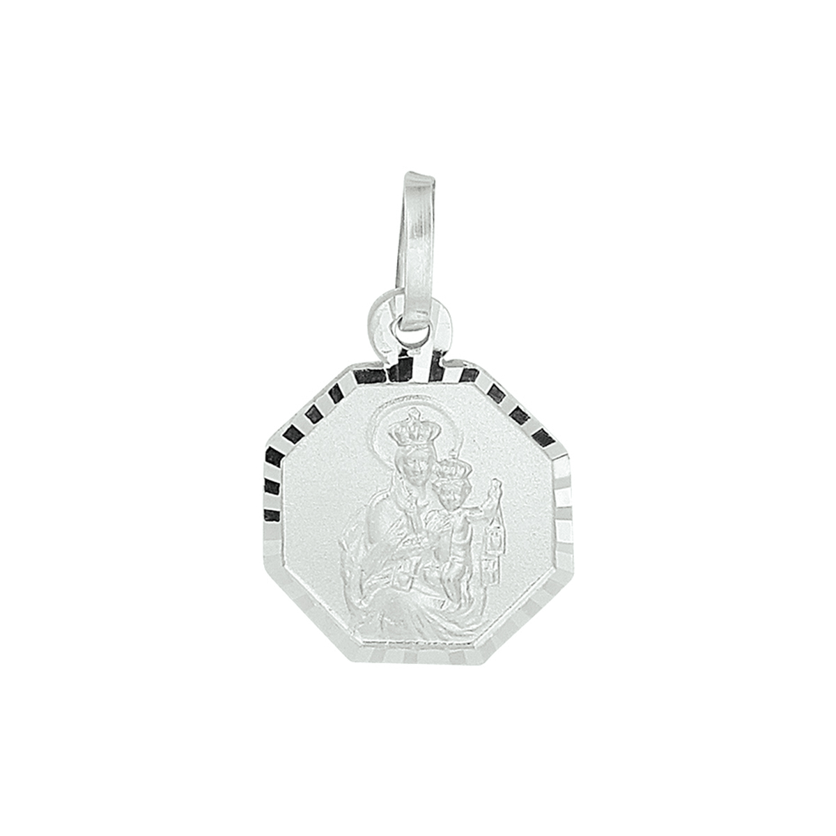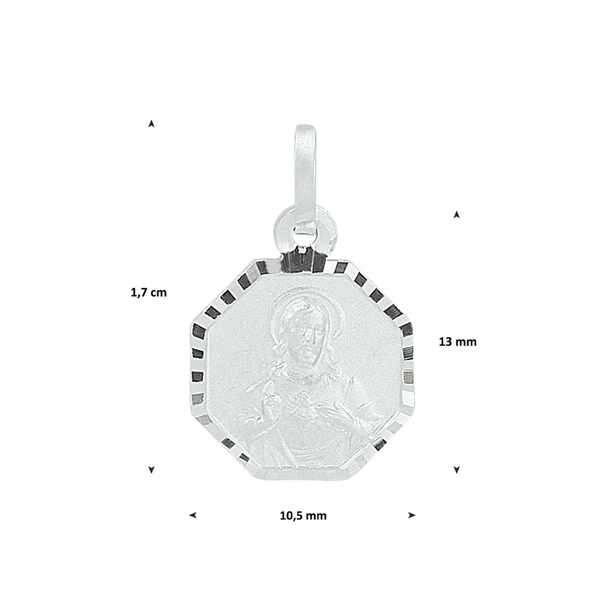 Zilveren dubbelzijdige scapulier hanger met afmetingen van 13x10.5mm en een totale hoogte van 17mm. De hanger is goed te combineren met een bijpassend collier uit onze collectie.