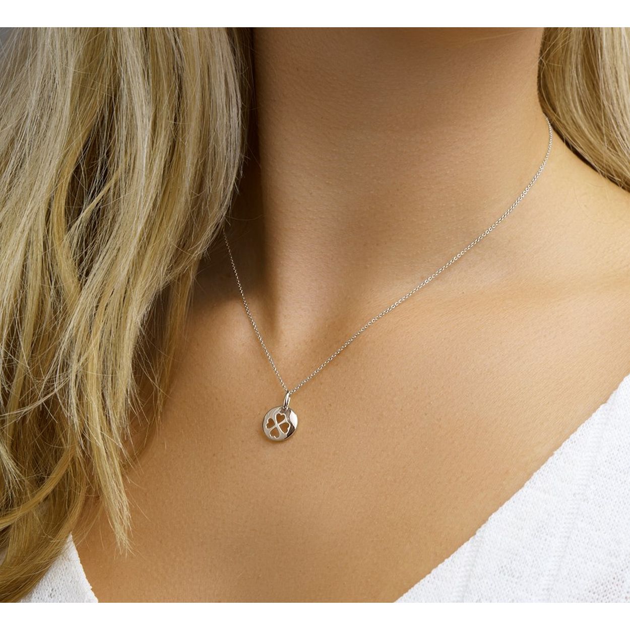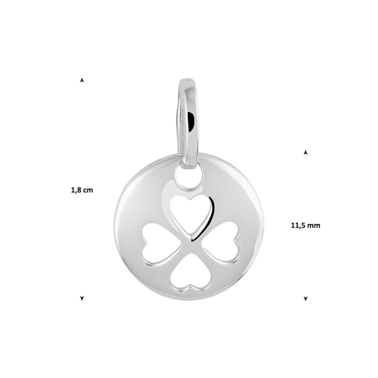 Gerhodineerd 925 zilveren ronde hanger uitgevoerd met een klavertje. De hanger heeft een totale hoogte van 1.8cm en een breedte van 11.5mm.