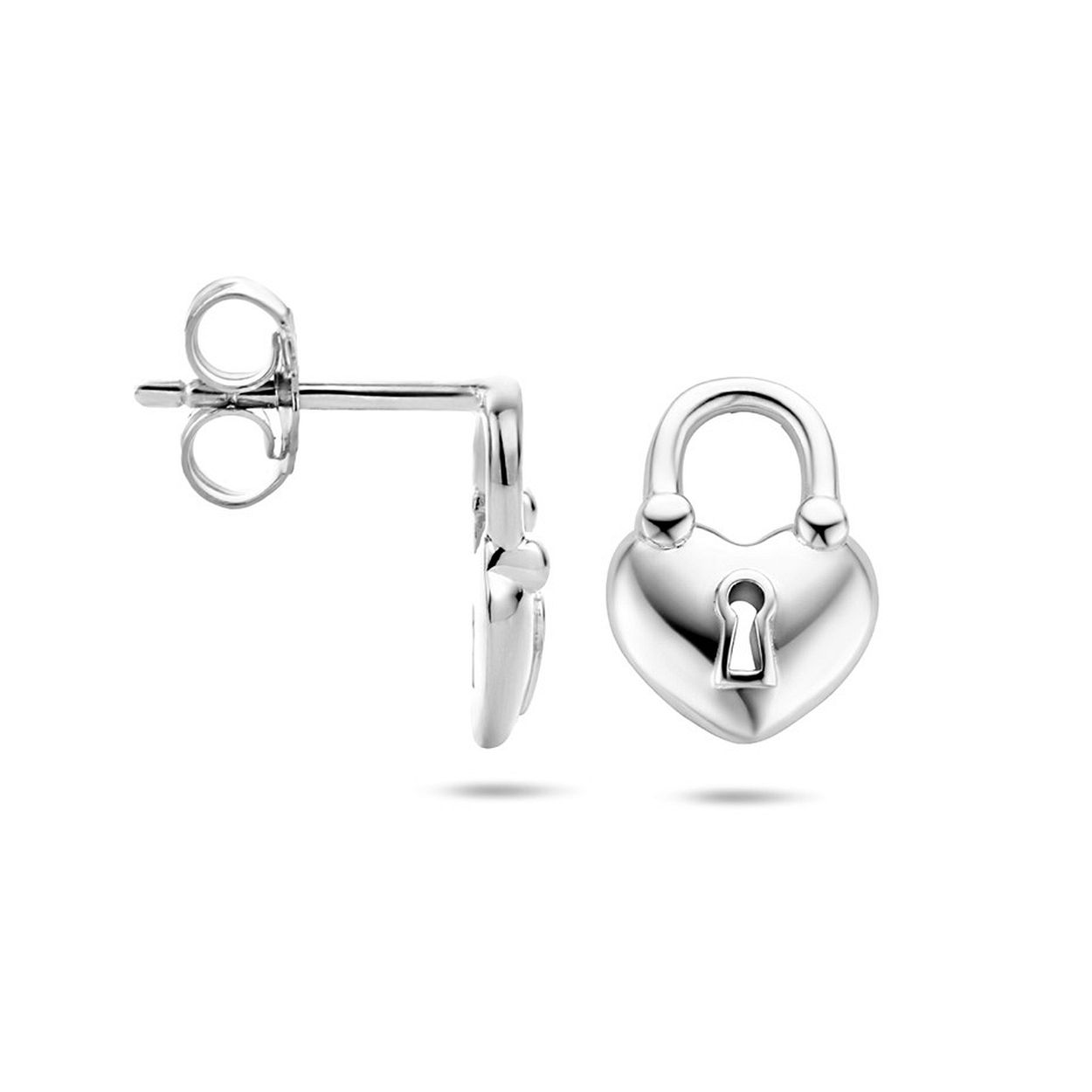 Gerhodineerd 925 zilveren oorknoppen uitgevoerd in de vorm van een hartje/slotje. De oorknoppen hebben een afmeting van 12x8.5mm.