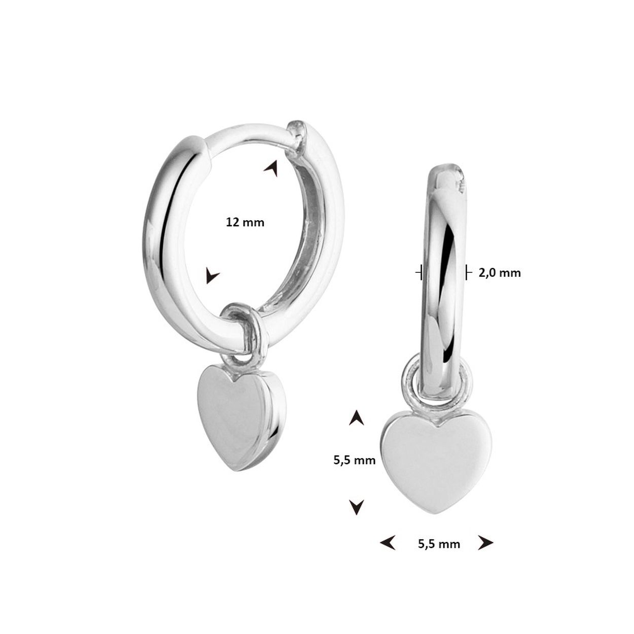 Gerhodineerd 925 zilveren oorringen uitgevoerd met een hangertje in de vorm van een hartje. De oorringen hebben een diameter van 12mm. De hartjes hebben een afmeting van 5.5x5.5mm.