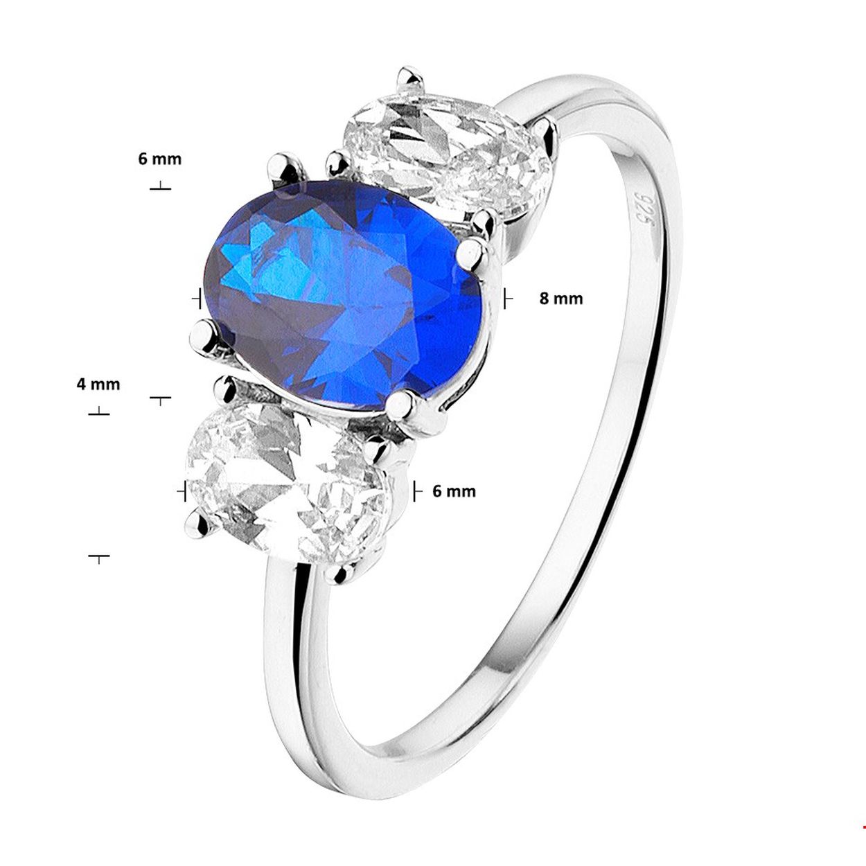 Beschrijving: Gerhodineerd zilveren ring uitgevoerd met een schitterende rij van zirkonia en een synthetische saffier. Glam up your outfit! Deze ring sprankelt je tegemoet en geeft je look direct een chique uitstraling.