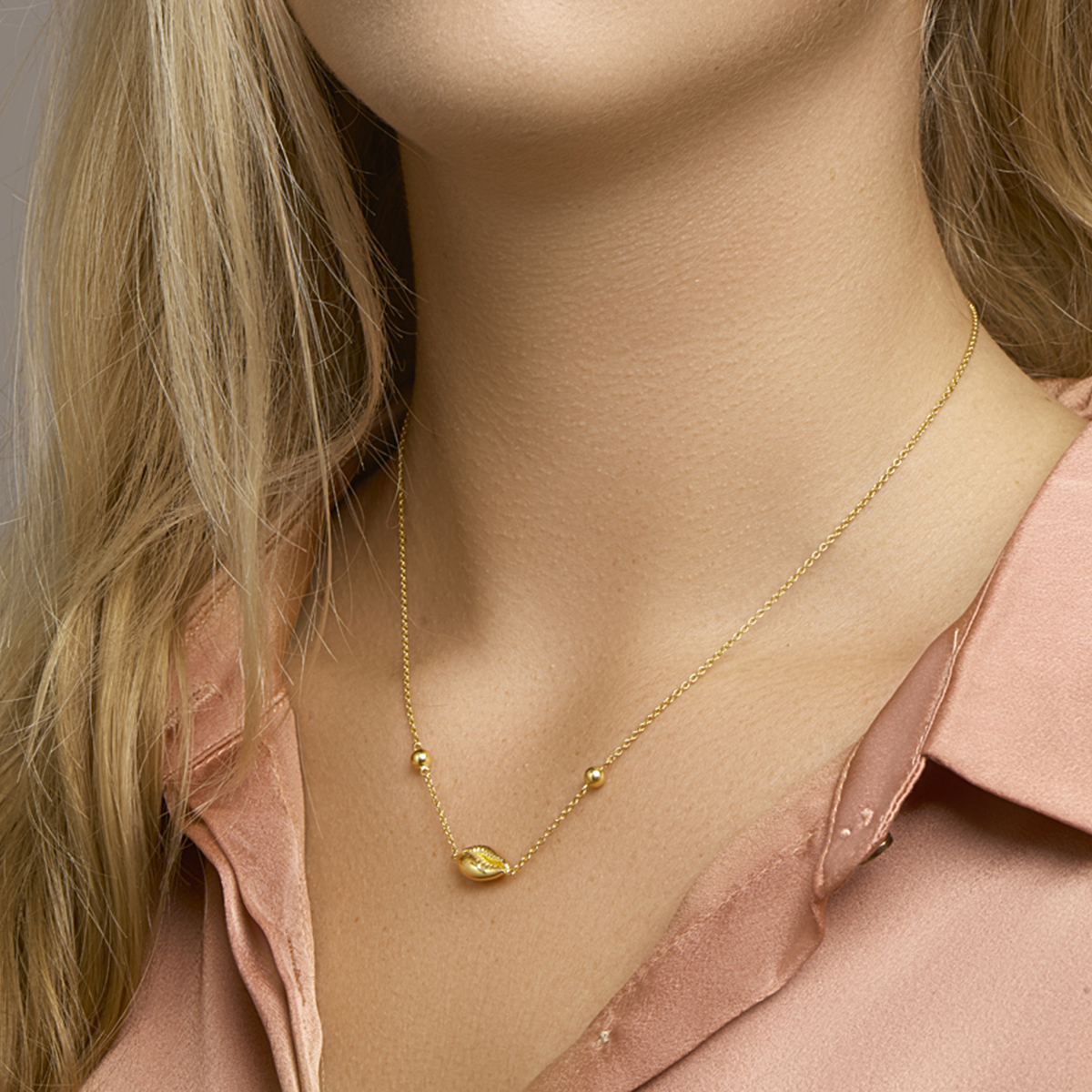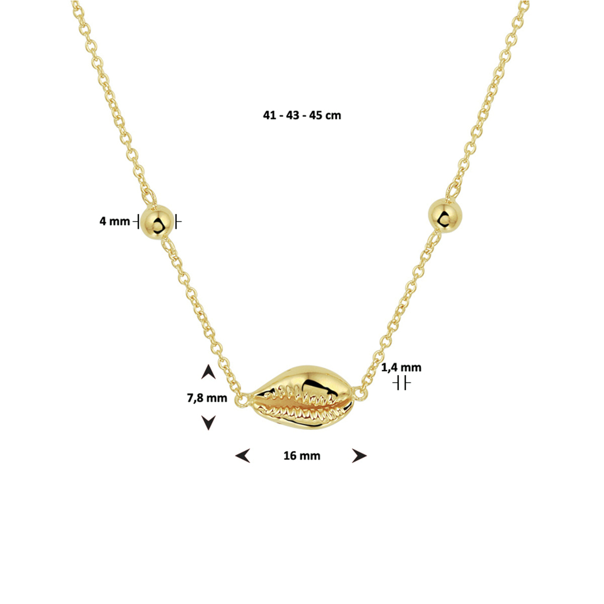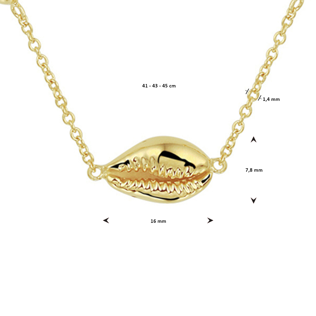 Verguld op 925 zilveren collier uitgevoerd met een schelp en een stevige karabijn sluiting. Het collier heeft draaglengtes van 41, 43 en 45cm. De schakelbreedte is 1.4mm. Geen garantie op plating.