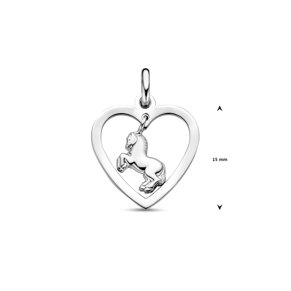 Gerhodineerd 925 zilveren hanger uitgevoerd in de vorm van een hart met een paard. De hanger heeft een totale hoogte van 20mm