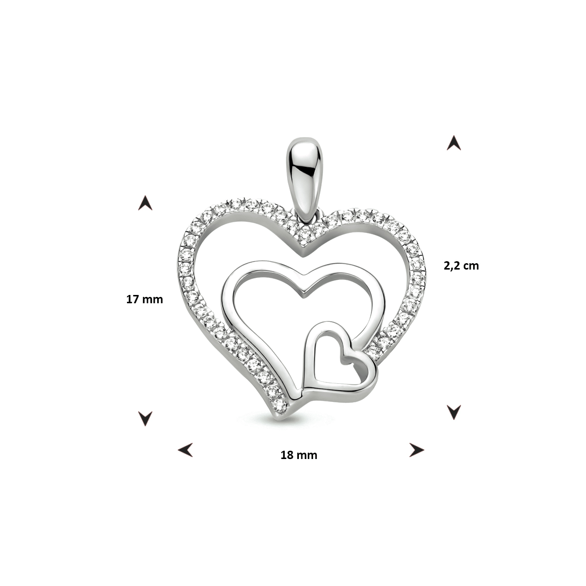 Gerhodineerd 925 zilveren hanger uitgevoerd in de vorm van een hart met daarin een schitterende zirkonia rij. De hanger heeft een totale hoogte van 2.2cm en een breedte van 18mm.