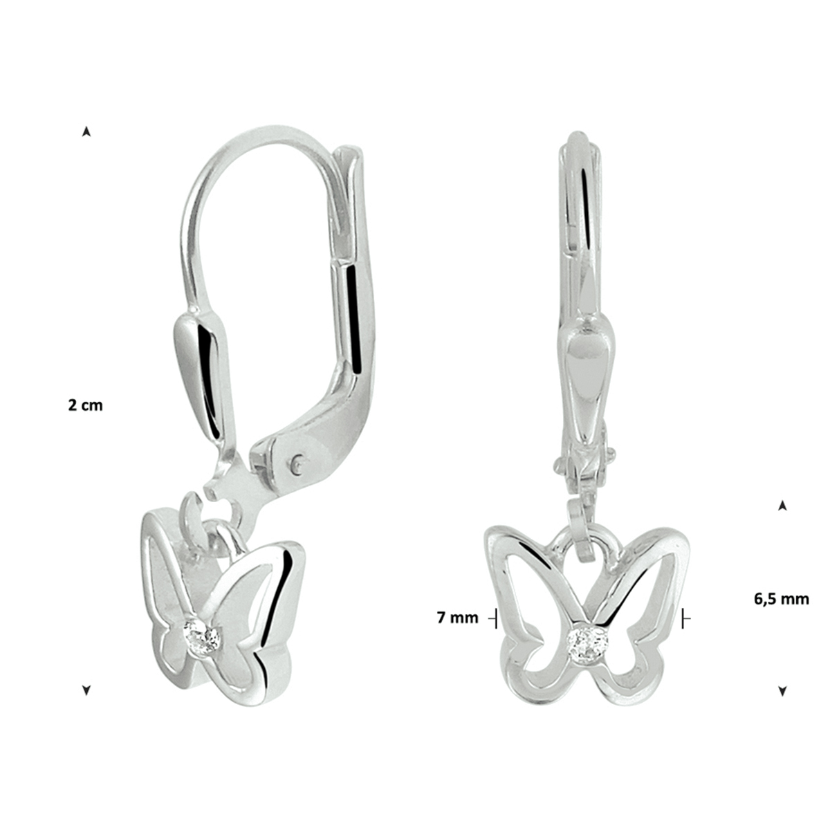 Gerhodineerd zilveren oorhangers met een vlinder van 6.5x7mm. De oorhangers zijn uitgevoerd met heldere zirkonia en hebben een totale hoogte van 2cm.