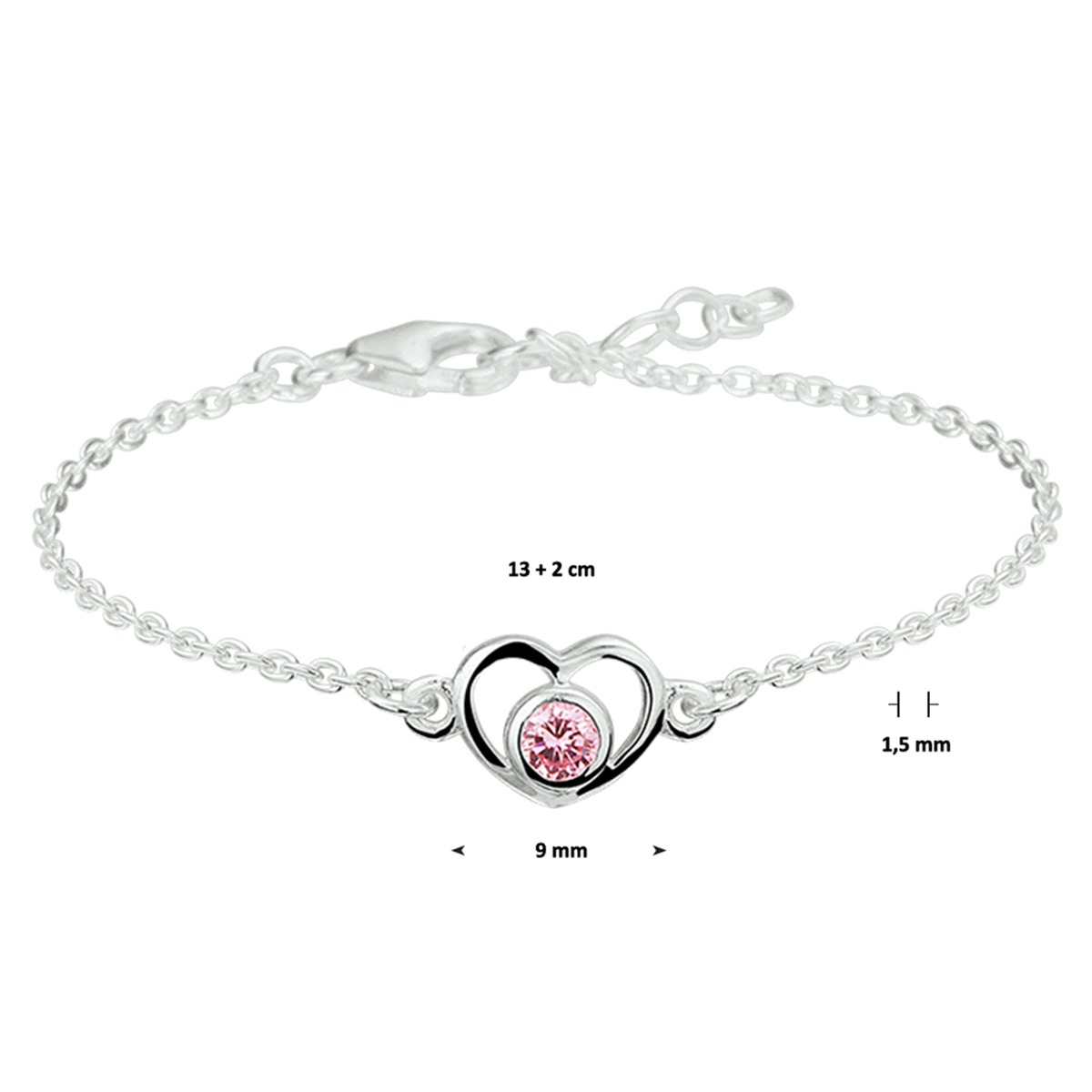 Zilveren armband met een open hart en roze zirkonia. De armband is onderdeel van een set. De lengte van de armband bedraagt 13cm met 2cm extensie. De schakelbreedte bedraagt 1.5mm.