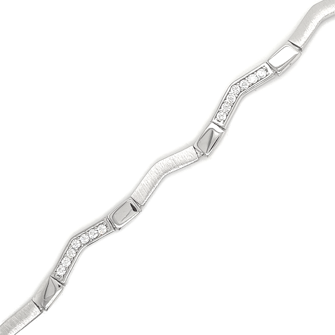 Deze armband is gemaakt van 925 zilver. De armband is gedeeltelijk gematteerd en gedeeltelijk glad gepolijst, de combinatie van mat/ glans geeft deze armband een erg mooie uitstraling. De glanzende schakels zijn vol gezet met zirkonia steentjes. Ook heeft de armband heeft een stevig karabijnslot.
