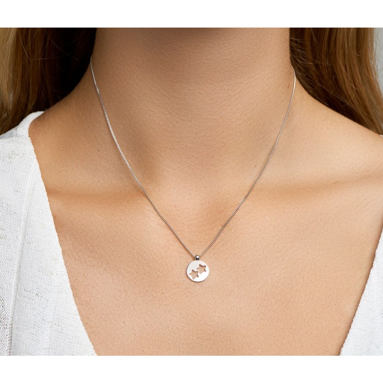 Zilveren collier met een rondje met daarin uitgestoken sterren.
